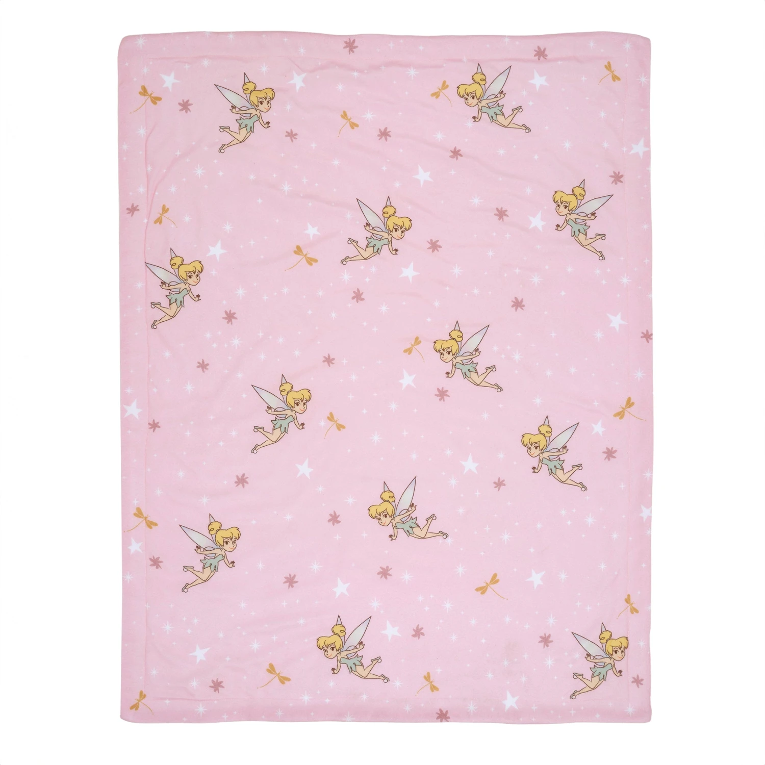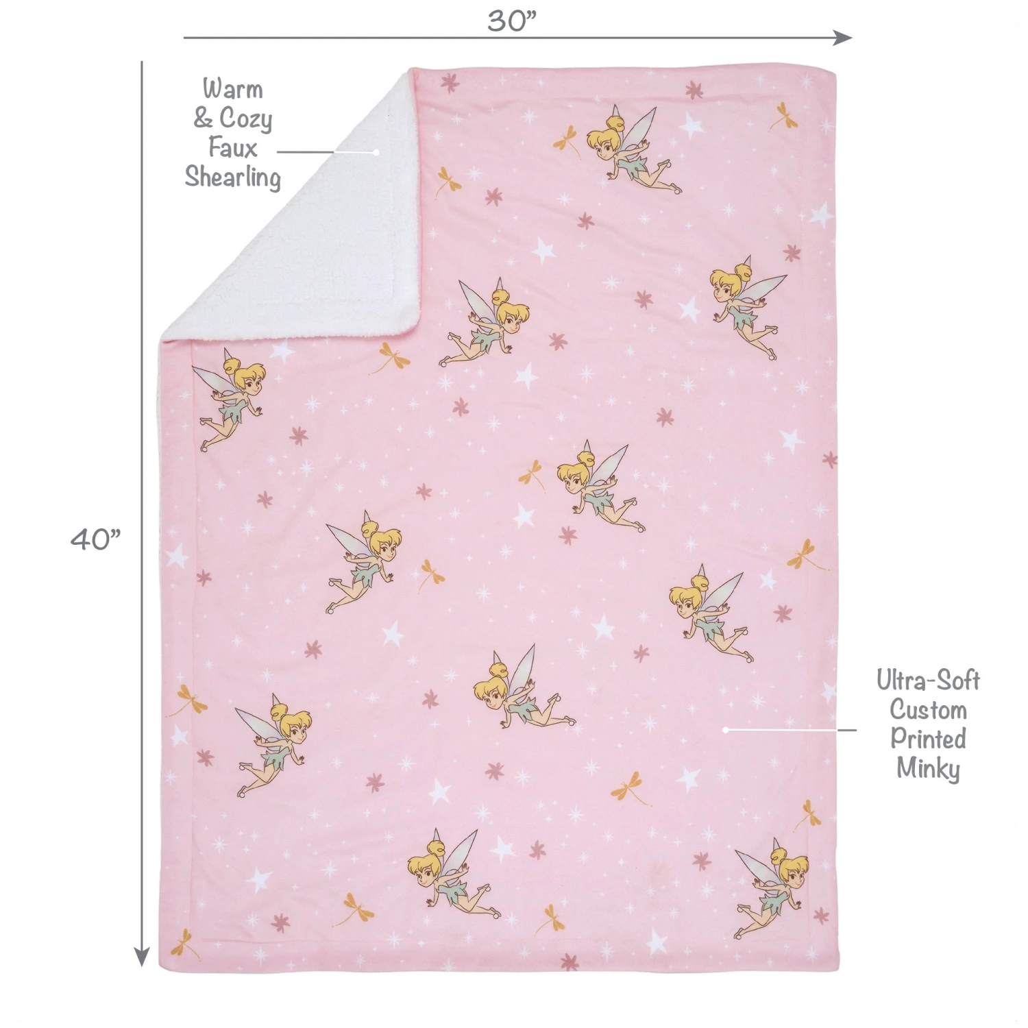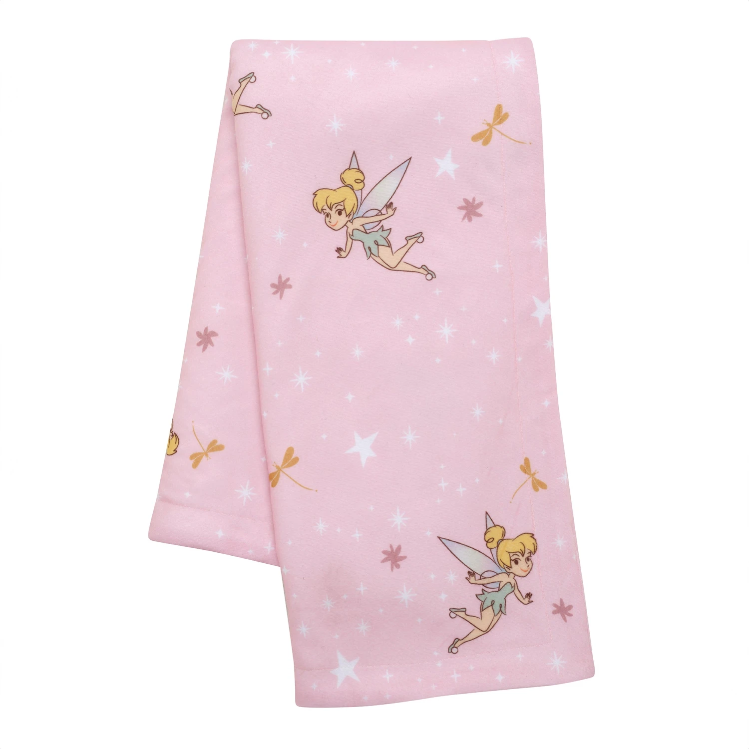 This soft and cozy 30” X 40” blanket is the perfect way to cuddle your little one. The front is a soft pink polar fleece with twelve Tinker Bells, white stars, dragonflies and pretty pastel flowers. Great to use as a stroller blanket, over a car seat, or for cuddling baby. The back is a soft, white lux faux shearling. This blanket makes a great baby shower gift or welcome home baby gift. Machine washable for easy care. SKU: 259034, UPC: 084122019171.