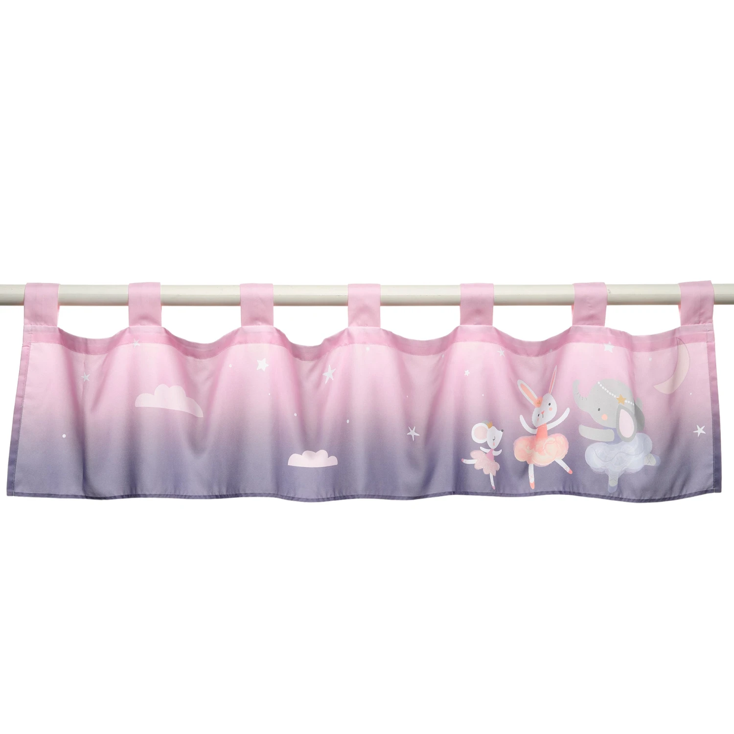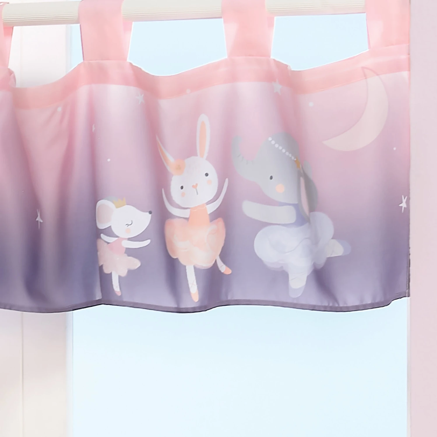 This pretty pastel window valance is 54 inches long and 13 ½ inches tall. It features a pink starry sky which gradually descends into lavender. Featured in the corner is a cute white bunny, an adorable gray elephant, and a sweet white mouse. All in their favorite little tutus. It is made in a soft microfiber material. SKU: 245029, UPC: 084122016200.