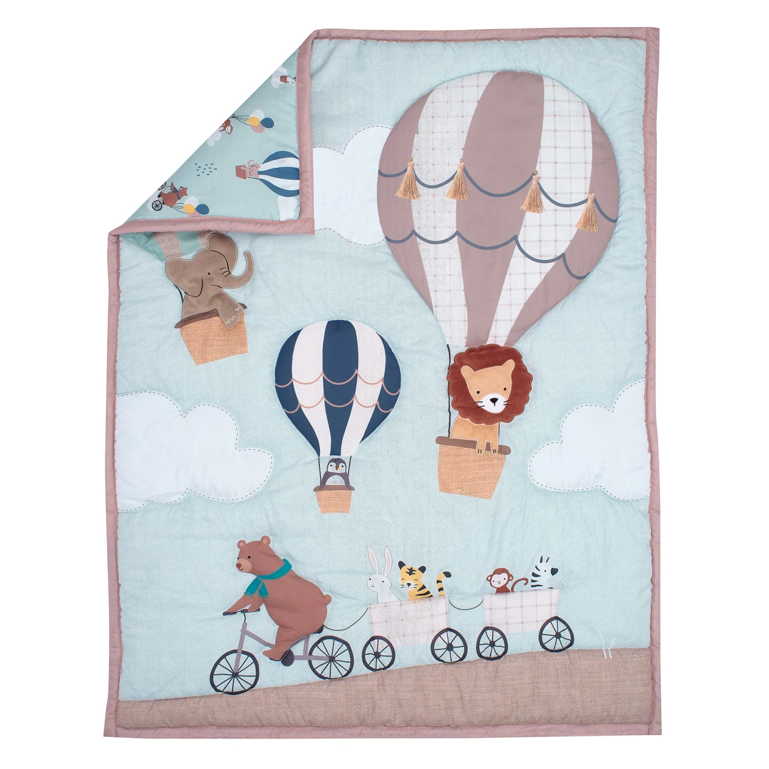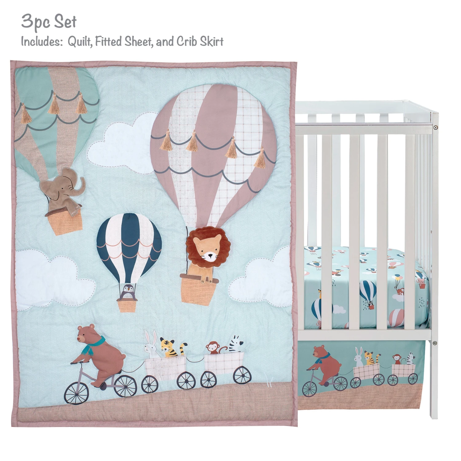 This three-piece crib bedding set includes one quilt, one fitted crib sheet and one crib skirt. It is made in a wrinkle resistant soft microfiber material. Featured is an appliqued gray velour elephant, a lion with an appliqued mane and face, and a sweet little penguin all in their own wide striped hot air balloon decorated with large tassels. The crib sheet is on a sky-blue background with multiple sized hot air balloons floating in the sky. A variety of animals are in the baskets having fun. Included are lions, tigers, zebras, penguins, rabbits, and elephants. The fitted crib sheet has elastic all the way around ensuring a safe and secure fit on a standard size mattress measuring 28” X 52”. The crib skirt adds the finishing touch to your child’s crib. Our adorable little bear named Kodiak is riding his bicycle and pulling little carts filled with animals. The 4-sided crib skirt has a 10” drop. SKU: 257003V, UPC: 084122015524.