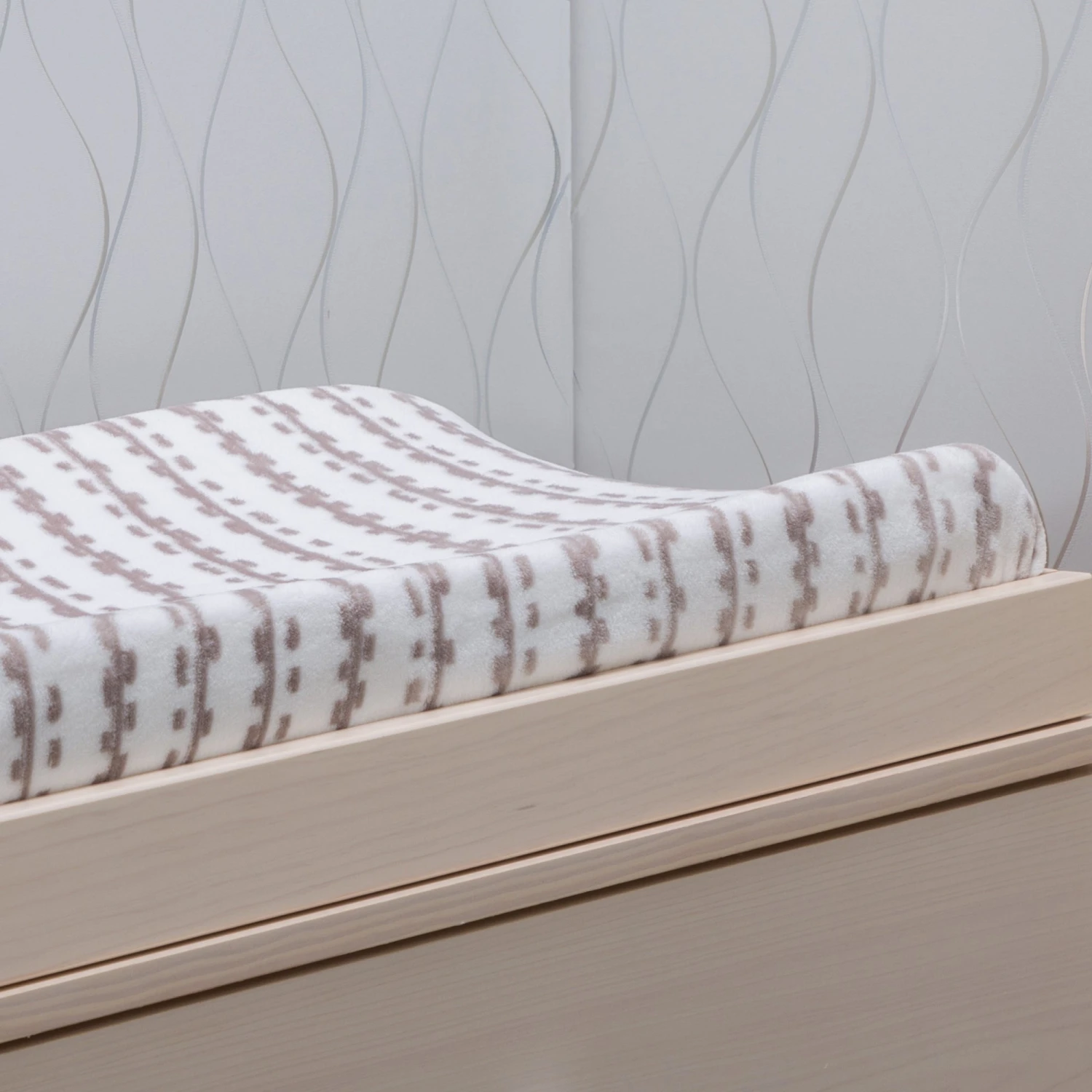 This trendy gray dotted stripe changing pad cover is a soft lux fleece fabrication. It is on a white ground and has summary holes for your changing pad straps so your little one is secure while getting their diaper changed. Measures 16” x 32”. Polyester. Imported. SKU: 720050, UPC: 084122725003.