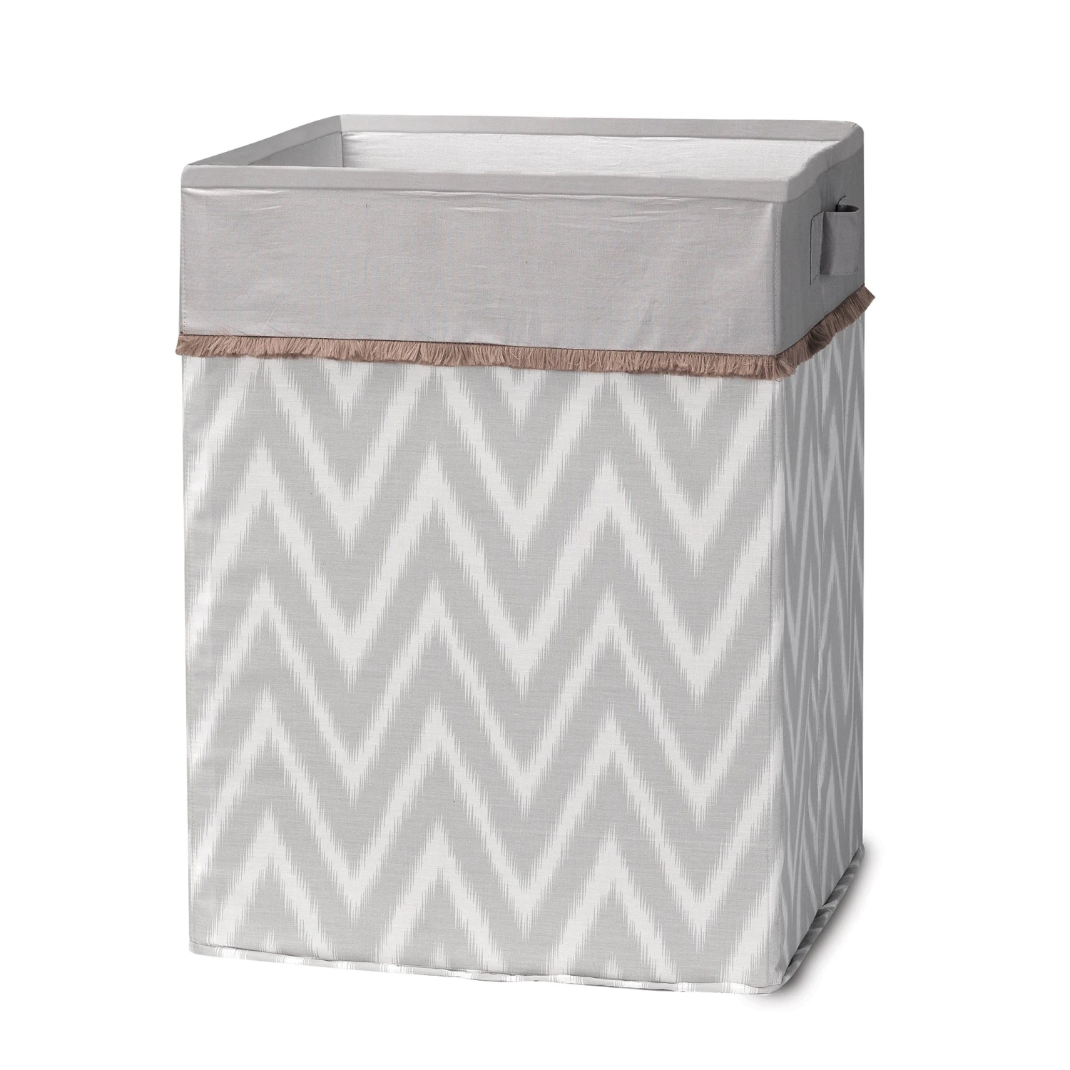 This lightweight hamper is a great way to store baby’s favorite toys. It is a neutral color palette of a gray and white chevron print with tan eyelash trim and a solid gray binding at the top. It measures 14” X 14” X 19” high. There are two side handles and it is fully collapsible for easy storage. SKU: 720038, UPC: 084122009226.