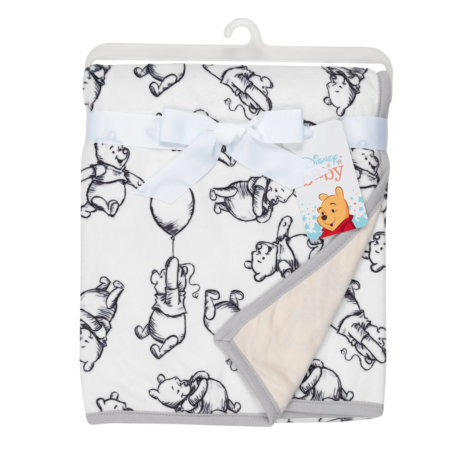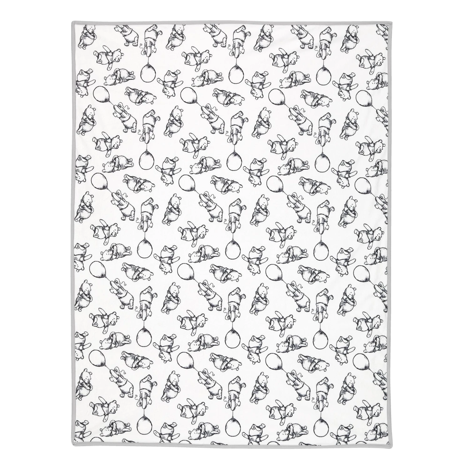 Everyone’s favorite bear, Winnie the Pooh, decorates this stylized blanket in a sketching charcoal color. Pooh is standing, marching forward, and holding on to his favorite balloon. He is on a white minky ground and the back of the blanket is a tan color cotton jersey blend. This fun, on the go must have blanket is machine washable for easy care. It is 30” X 40” and is snuggly soft. SKU: 630034P, UPC: 084122009714.