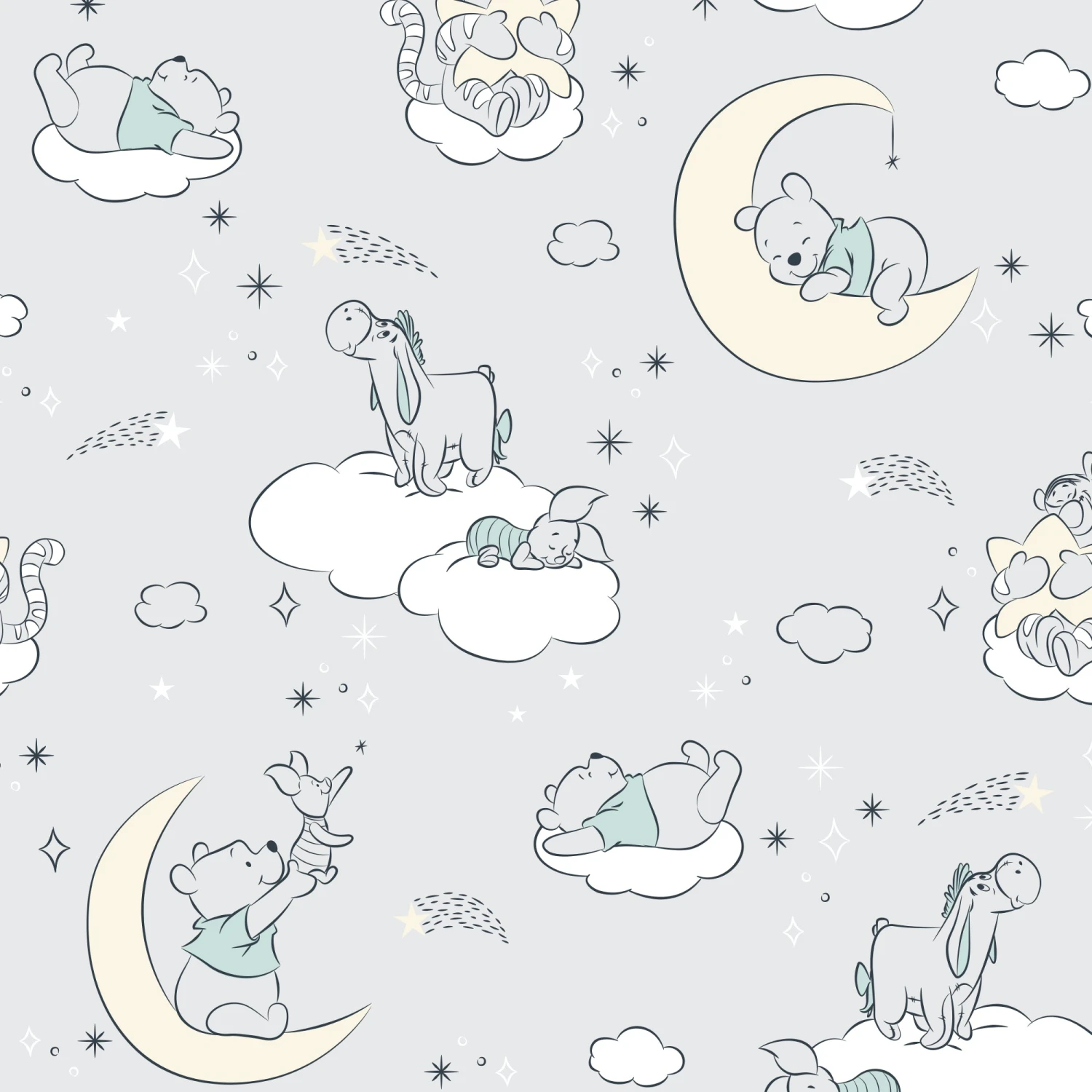 This officially licensed Disney Baby Winnie the Pooh fitted crib sheet is made in a soft microfiber material on a gray ground. It features Pooh in various positions, Piglet, Eeyore, Tigger, clouds, crescent moons, and stars. There is elastic all the way around ensuring a safe and secure fit on a standard size crib mattress measuring 28” X 52”. It is machine washable for easy care. SKU: 891006BG, UPC: 084122016514.