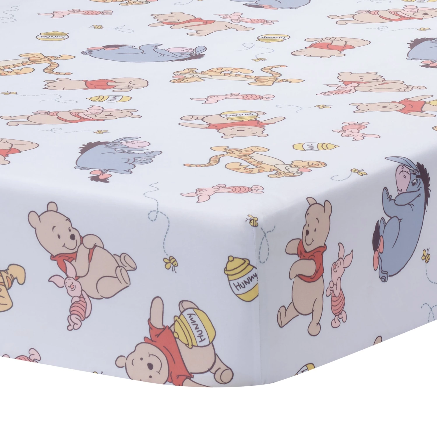 Welcome your little one home with a little Disney magic. This Winnie the Pooh three-piece crib bedding set includes one quilt, one fitted crib/toddler sheet, and one crib skirt all made in a supersoft microfiber material which is gentle on baby’s delicate skin. The quilt features an appliqued Pooh who is 20 inches tall and made in a soft textured boucle material and is wearing his favorite brick red shirt. Tigger, Eeyore, and Piglet are close by and heading towards Pooh’s iconic Hunny Pot. The fitted crib/toddler sheet is on a clean white ground with multiple images of Pooh, Tigger, Eeyore and Piglet in some of their favorite poses. There is elastic all the way around ensuring a safe and secure fit on a standard size crib or toddler mattress measuring approximately 28” x 52”. The crib skirt adds the finishing touch to your child’s room. Pooh sits happily on the right hand corner with Piglet by his side. There is a one inch solid blue/gray sage green border at the bottom of the crib skirt. SKU: 292003V, UPC: 084122019638.