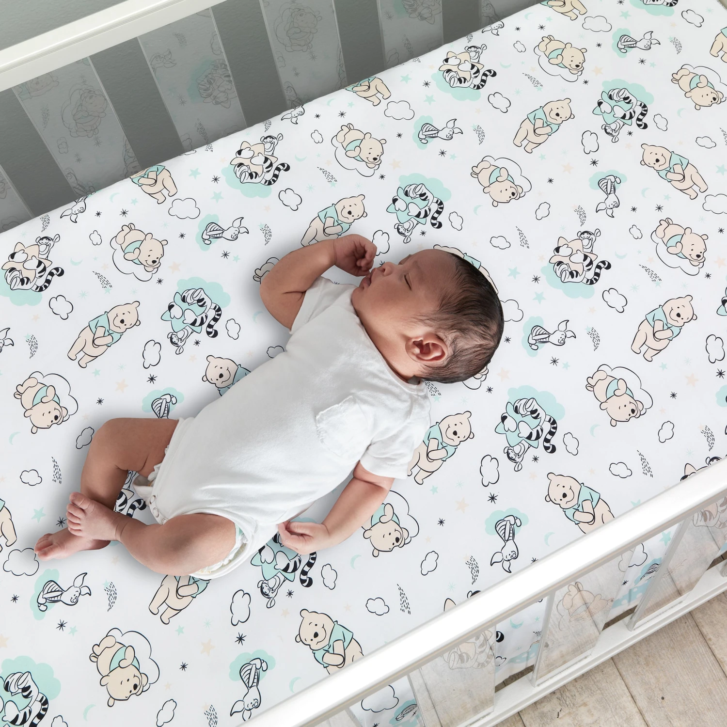 This charming Disney Baby Winnie the Pooh fitted crib sheet is made in a soft microfiber material that is digitally printed in a high resolution which enhances the colors and is eco-friendly. It features Winnie the Pooh in different positions, Tigger hugging yellow and blue stars, and Piglet sitting on a cloud looking at the sky filled with stars, clouds, and the moon. There is elastic all the way around ensuring a safe and secure fit on a standard size crib mattress measuring 52” x 28”. SKU: 782006B, UPC: 084122012837.