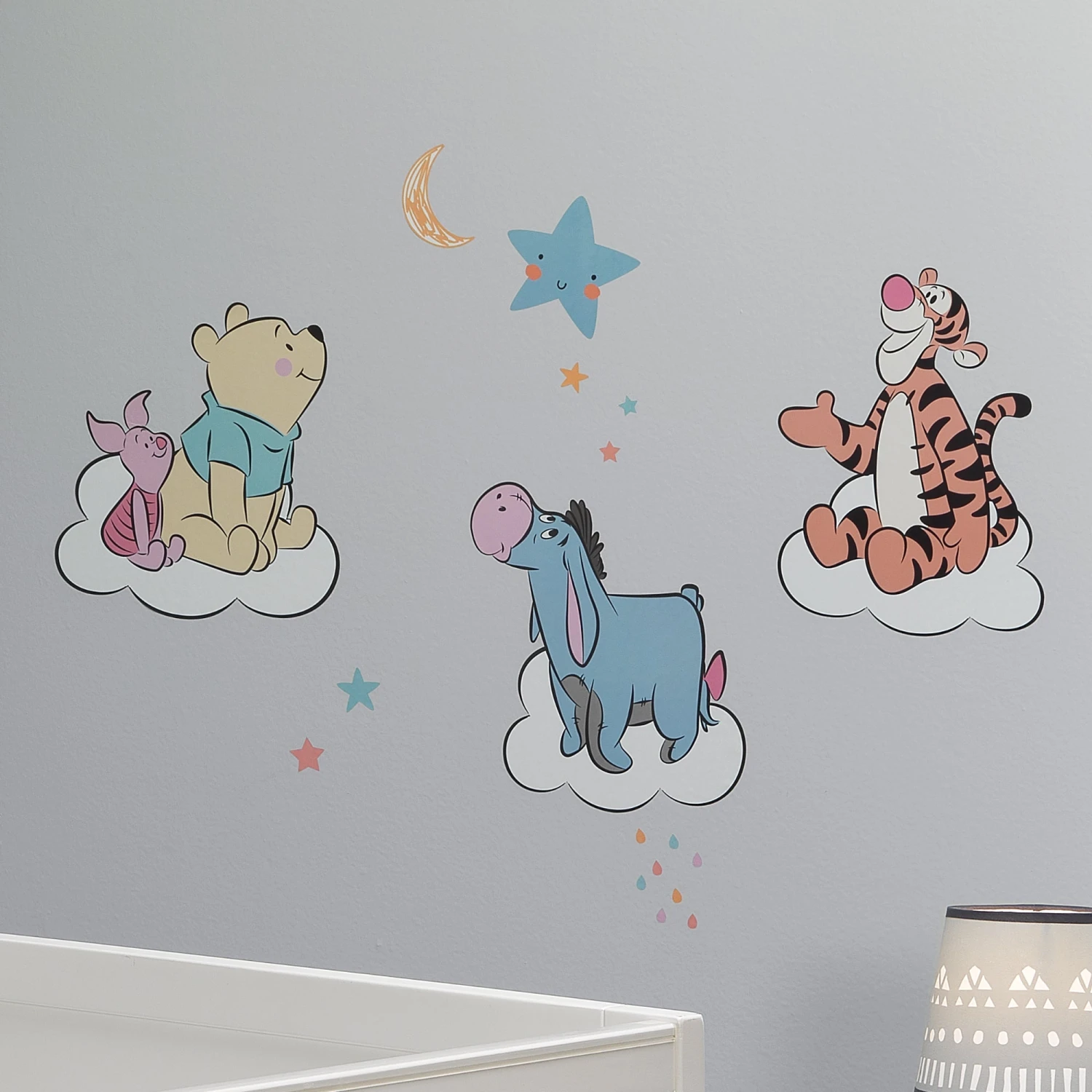 Decorate a feature wall in your child’s room with these Disney Baby Winnie the Pooh Hugs custom wall decals. There are three sheets included, each is 12” X 18”. There are 27 pre-cut pieces. The finished size is approximately 30” X 39”. Featured is Winnie the Pooh with Piglet on a floating cloud, Tigger with a big smile and one hand open on a white cloud, and Eeyore looking up at the sky on a cloud. There are colorful multi-sized stars along with a crescent moon. These are easy to apply, create the look of a mural, and will not harm your walls. SKU: 782048, UPC: 084122012868.