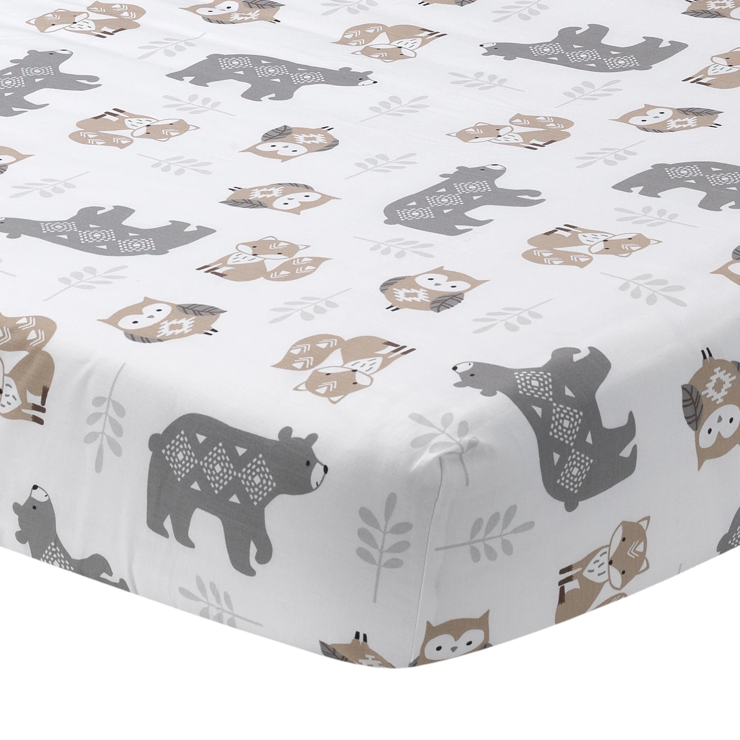 This Woodland Forest 5-piece nursery baby crib bedding set includes one highly detailed quilt, two 100% cotton fitted crib sheets, one crib skirt (dust ruffle) and a full set of wall decals/appliques. This woodland designed quilt features a friendly gray corduroy bear with diamond shaped embroideries and a cute little walnut colored squirrel marching happily on his back. A tan colored mischievous minky fox sits close by and has a 3 dimensional tail with embroidered details. All the while a wise owl with dimensional herringbone wings stands proudly on an appliqued branch with embroidered leaves. The back of the quilt is an on trend gray herringbone print. One of the 100% cotton fitted crib sheets is a trendy two-toned chevron print and the other 100% cotton fitted crib sheet is an adorable animal print with our favorite woodland critters. The crib skirt is in a warm gray, has two pleats, the bottom is a walnut colored arrow print and a white twill tape separates the two fabrics. Complete this whimsical woodland theme with our easy on easy off wall decals. The tree branches and leaves come in separate pieces so you can arrange the leaves any way you wish. Included are Oscar, our friendly bear along with the wise owl, mischievous fox and spunky squirrel. SKU: 684005V, UPC: 084122008885.