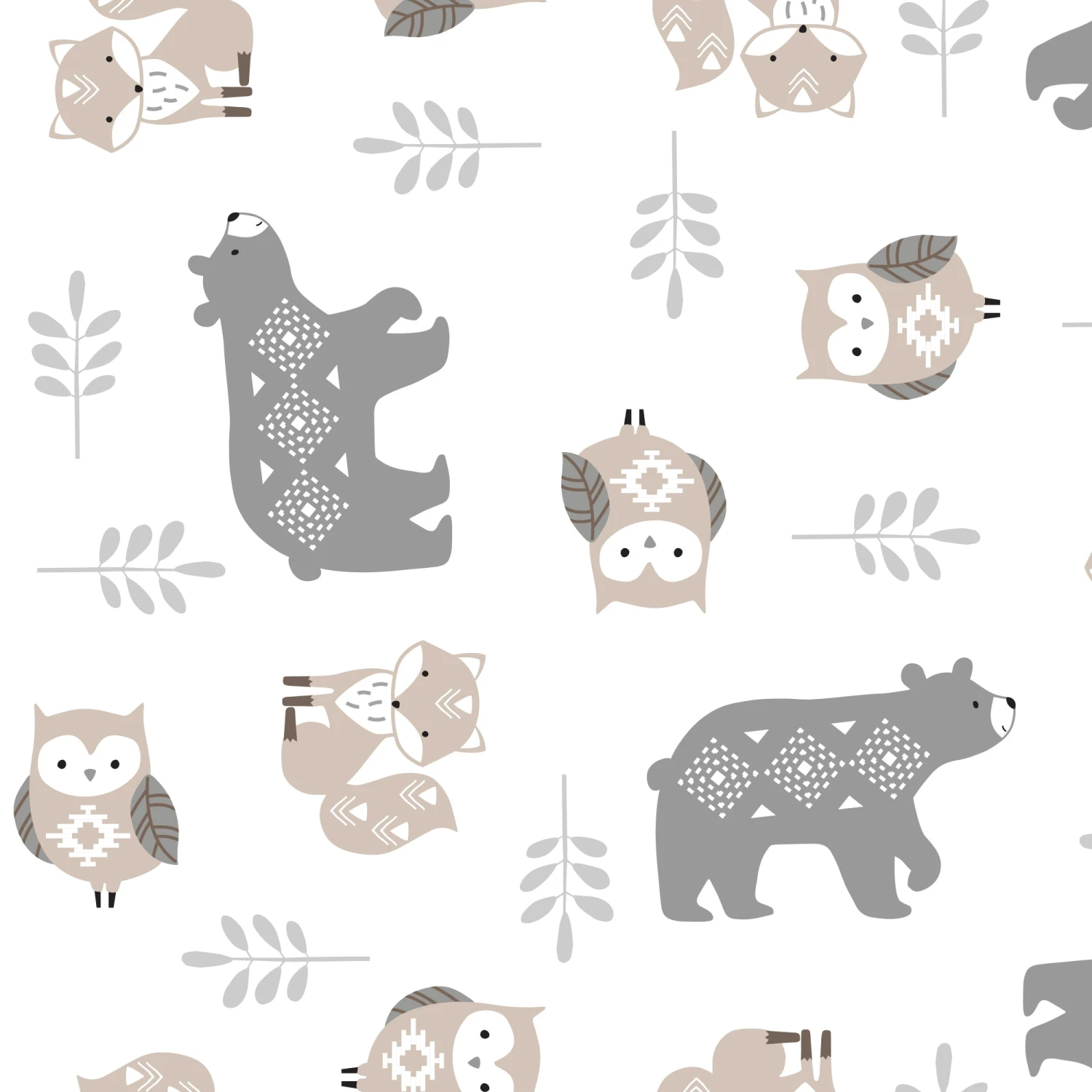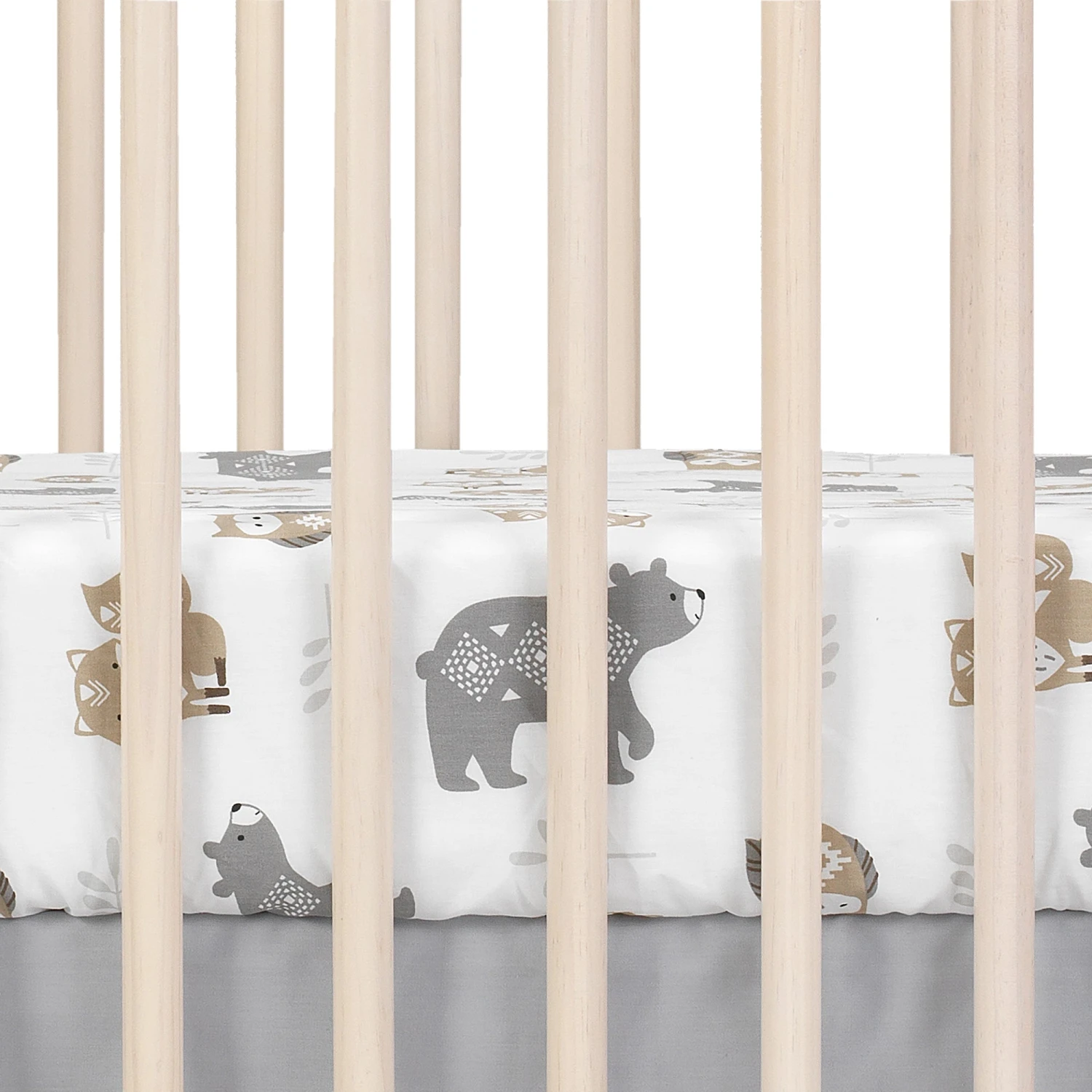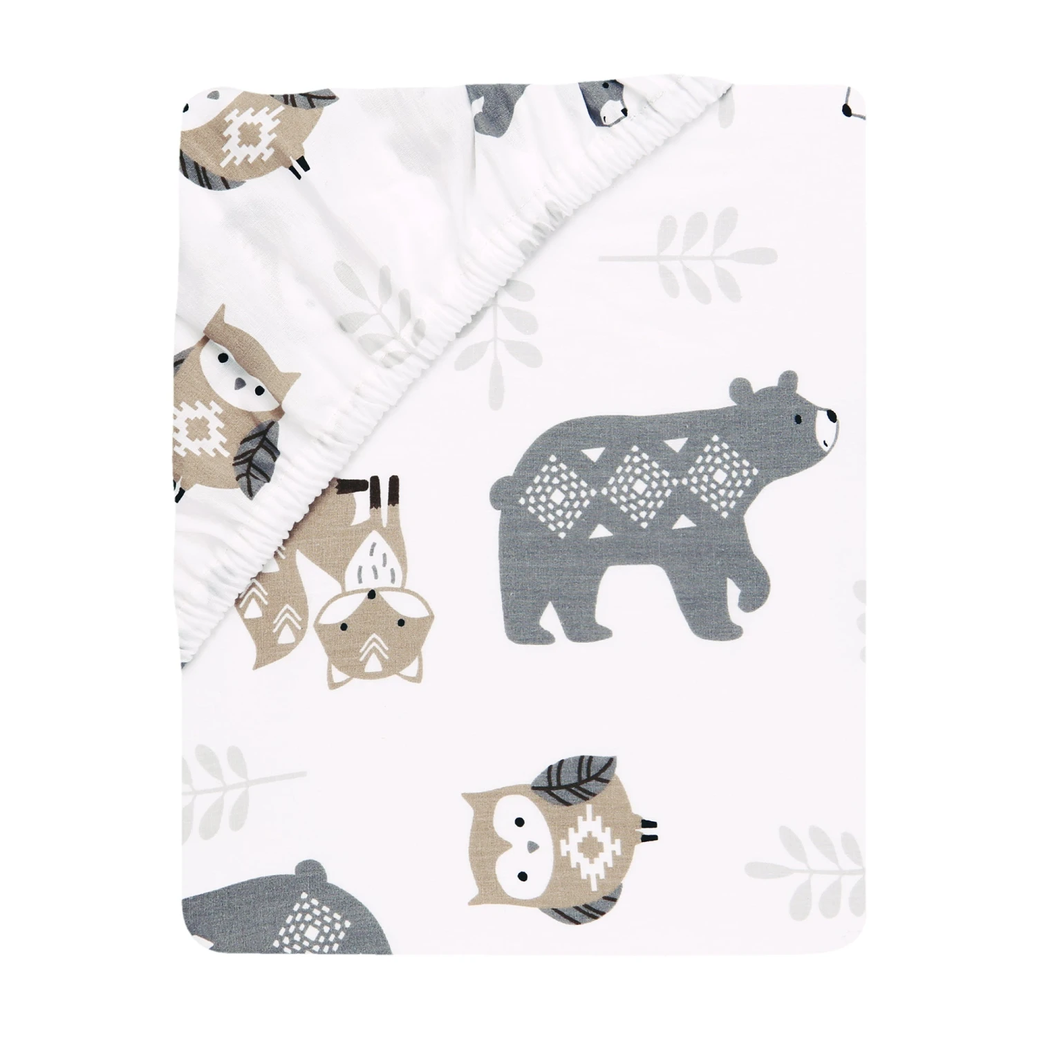 This 100% breathable cotton fitted crib sheet is an adorable animal print featuring a friendly gray bear, a mischievous tan fox and a sweet wise owl on a crisp white ground. This breathable fitted crib sheet has elastic all around for a safe and secure fit on a standard size crib mattress measuring 52” X 28”. SKU: 684006B, UPC: 084122008892.