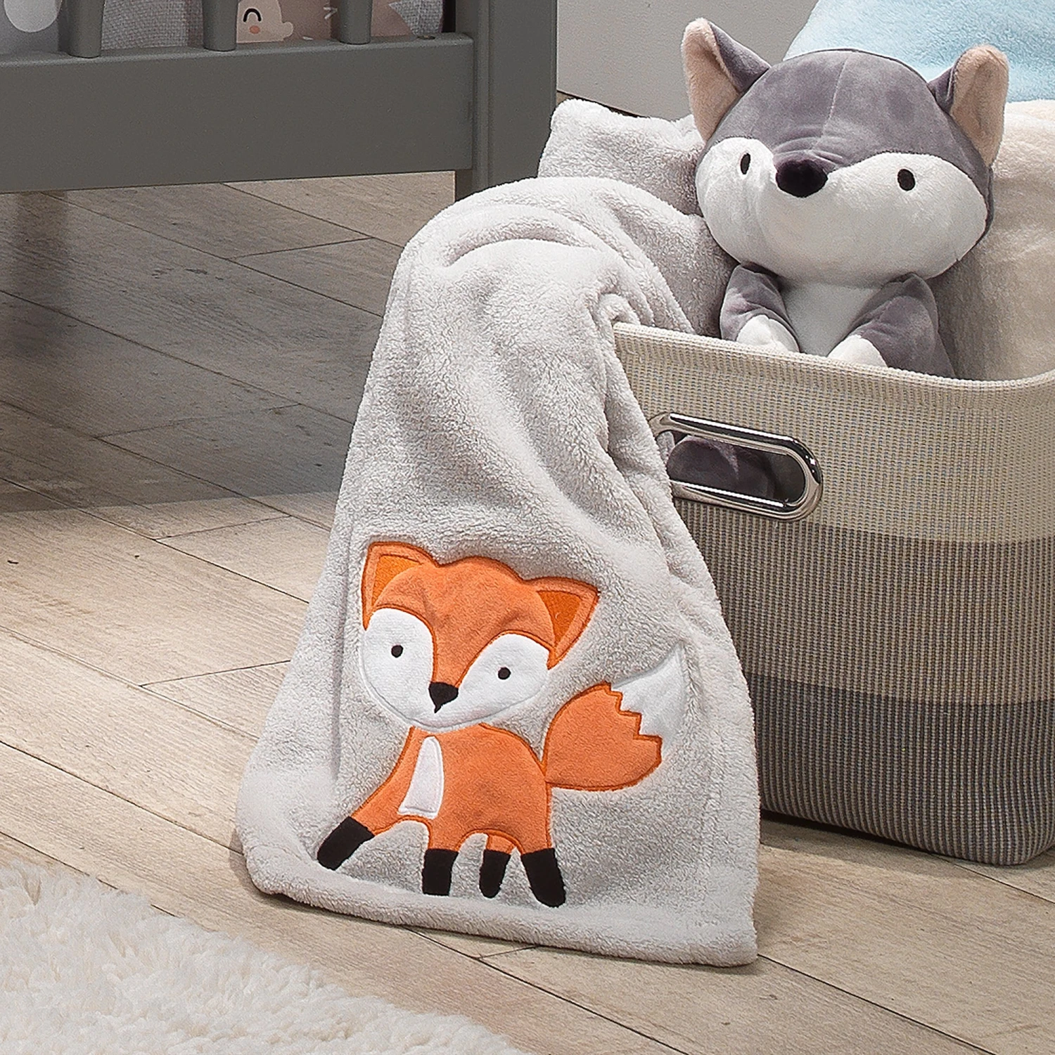This soft gray coral fleece blanket is 30” X 40” and is the perfect size for cuddling your little. The right hand corner features our sweet orange fox. He is made of a soft velour and the tip of his tail, his face and chest are trimmed in white. SKU: 234034, UPC: 084122008977.