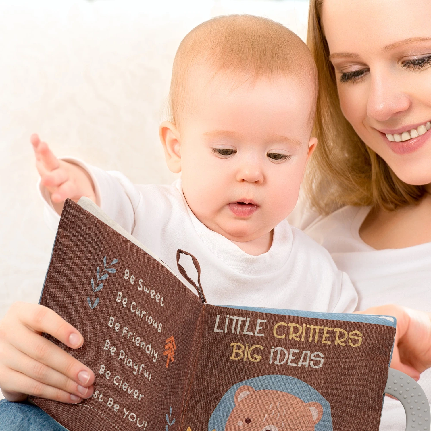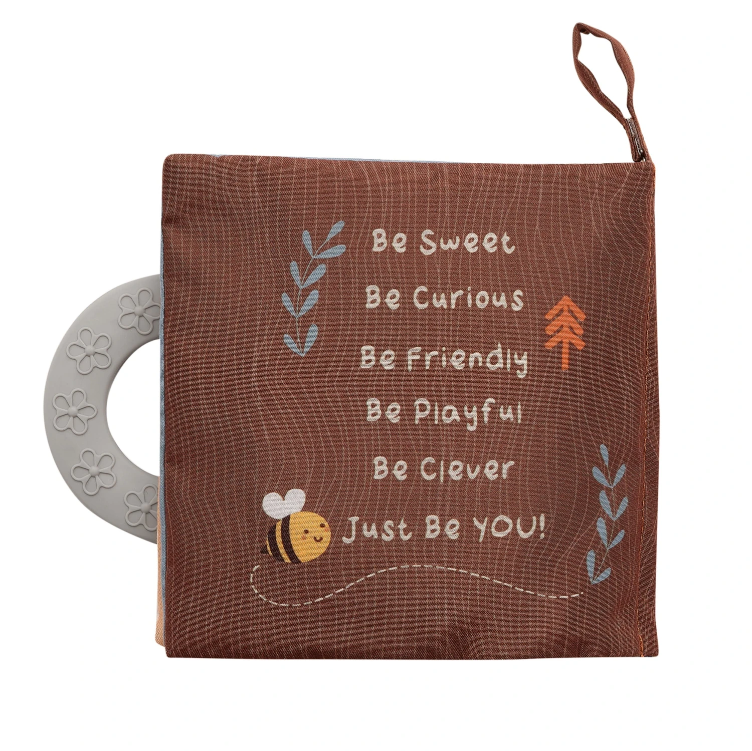 This Lambs & Ivy foldable book is a story about woodland animals that’s easy for little ones to follow. The soft microfiber book is loaded with developmental and interactive features such as a gray teether, mylar mirror, appliqued critters, dimensional pocket, a rattle, squeaker, and several crinkle pages. This charming woodland story is about a bear, a bunny with long dimensional ears, a squirrel, an owl, bees, and a fox in a woodland wonderland filled with trees, acorns, leaves, and bushes. Included with this book is a 6” tall plush bear made in a textured curly boucle with white trim. He is wearing his favorite yellow scarf with BE SWEET embroidered in black. It makes a super cute baby shower gift or welcome home baby gift. SKU: 728064W, UPC: 084122015661.